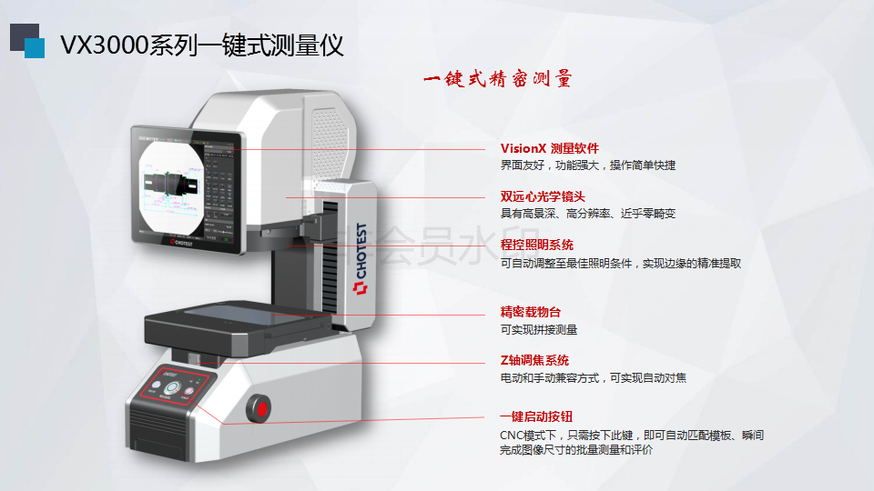 隨著科學技術的不斷進步,工業現代化不斷朝著自動化、智能化、數字化方向發展,傳統測量儀器如投影儀、影像測量儀、工具顯微鏡、輪廓儀、游標卡尺、千分尺等,在尺寸輪廓測量時面臨著諸多如“測量對象需要定位或原點定位費時、批量測量操作時間長、不同測量人員導致測量結果不同、數據統計管理繁雜等”一系列的弊端,已經難以滿足現代工業生產過程中有關高精度、高效率、高可靠性的測量需求。為滿足現代化工業測量需求,中圖儀器VX3000系列一鍵式測量儀順勢而生!