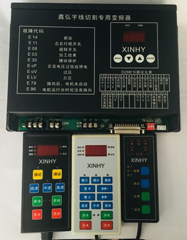 三個導電塊時的接法 兩個導電塊時的接法 遇到問題時的解決: 1. 開絲筒后,剛開始轉得很快,越轉越慢,后來就停了,數碼管左上角的HFP燈仍然亮,關機后HFP燈滅。 解決方法:YK型變頻器增加了“自動省電”功能,變頻器開高頻后會自動降低輸出到絲筒電機的電壓,如果“自動省電百分比”調得太大,絲筒阻力又比較大,就會出現這種情況。應將“自動省電百分比”調小一些,同時將“低頻力矩提升”調大些。 如果絲筒阻力過大,應先檢修,或將“自動省電百分比”調為0,不使用“自動省電”功能。 2. 剛安裝的帶手控盒且有撥碼開關的變頻器,若是遇到上電不能開運絲和水泵,且沒有故障代碼顯示,數碼管上顯示“段速”和“頻率值”,解決方法是檢查變頻器撥碼開關上“四鍵”和“點動”的狀態,若是D25針上腳④關水、⑤開水、⑥關絲、⑦開絲沒有任何接線,將其撥到點動狀態,問題即可解決;若是帶手控盒的變頻器外接開水、關水、開絲、關絲按鍵控制,此時撥碼開關上按鍵控制一定要與外接按鍵控制相一致。 軟硬件設計,生產:洛陽市洛龍區鑫弘宇電子設備廠 地址:河南省洛陽市洛龍區聶潘路62號(潘寨段) 電話/傳真:0379-65829091 聯系人:何晴波 手機:13837973389 QQ:602366770 網址:www.xqgbpq.com 郵政編碼:471000 阿里旺旺:xiaotao536 版本:180902