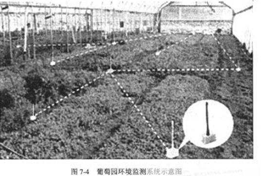 該葡萄園環境監測系統應用方案如圖7-4所示。它所使用的器件是加州大學伯克利分校研制并授權商業化的用于無線傳感器網絡研究與應用的高科技產品。在該監測系統中,首先把若干無線傳感器節點布放在葡萄園內,每隔一分鐘檢測一次土壤溫度、濕度和日照等;然后把測得數的據通過無線通信技術發送到信號接收節點;再通過網絡發送到計算機上,再由計算機系統中的相關應用軟件對數據進行分析處理;最后由葡萄園主從顯示系統中觀看其分析結果。