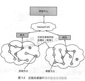 在溫室環境中,單個溫室可以作為無線傳感器網絡一個測量控制區,網絡中通過采用經過多個節點轉發來實現信息的傳遞(多跳的方式)。網絡中采用不同的傳感器測量節點和具有簡單執行控制的節點(能對風機、調溫機器、閥門等設備進行相關控制)構成無線傳感器網絡,其中節點用來測量土壤濕度、土壤成分、PH值、溫度、空氣濕度、氣壓、光照強度和C02濃度等數據,以便知道溫室中的環境狀況,同時將生物信息獲取方法應用于無線傳感器節點,為對溫室環境進行適當的調控提供科學依據。最終使溫室中的傳感器執行控制的標準化、數據化,利用網關實現控制裝置的網絡化,從而達到現場組網方便、提高作物產量、改善品質、調節生長周期、提高經濟效益的目的,方案網絡結構如圖7-5所示。