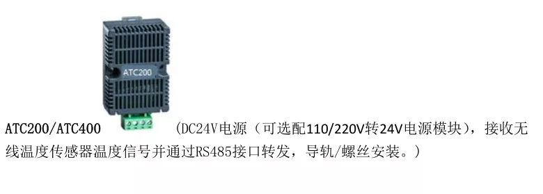 說明:ATC400 無線溫度收發(fā)器最多可連接 240 路無源無線溫度傳感器 ATE300(捆綁式安裝),可接收多臺(tái)柜內(nèi)的無線溫度傳感器溫度信號(hào)。