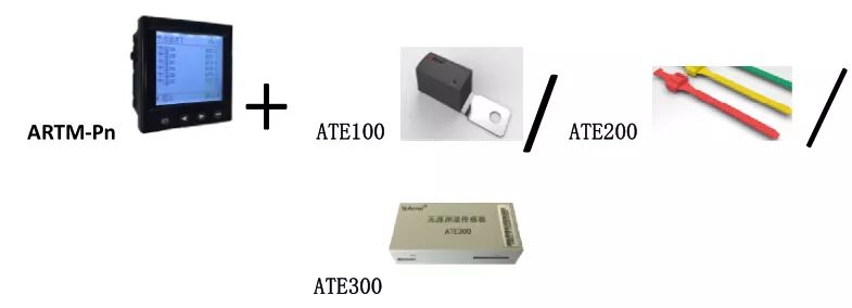說明:ARTM-Pn 無線測(cè)溫裝置最多可連接 18 路無線溫度傳感器,無源(CT 取電)方式為 ATE300(捆綁式安裝),有源(電池供電)方式為 ATE100(螺栓式安裝,主要用于電纜/銅排等螺絲固定的搭接點(diǎn))和 ATE200(表帶式,主要用于斷路器觸頭等接點(diǎn)捆綁安裝,因安裝較 ATE100 更方便,電纜/銅排等搭接點(diǎn)也常選用)。